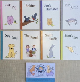 The introduction of words with phonetic elements is similar to a systematic phonics program, but the readers include some more difficult words earlier than strictly vocabulary-controlled readers do. The short books are for beginning readers but don’t limit the vocabulary in the first few readers to consonant-vowel-consonant words and words like an, on, and is as we usually find in beginning phonetic readers. Instead, the first reader, Pink Pig, uses the more difficult words pink and cool, and the second reader, The Pond, uses words like pond, still, stick, jumps, and swims. This means that the readers need to be introduced after students have begun to learn some words with consonant digraphs and other phonograms that are beyond the first part of a reading program, or else learn these as sight words.